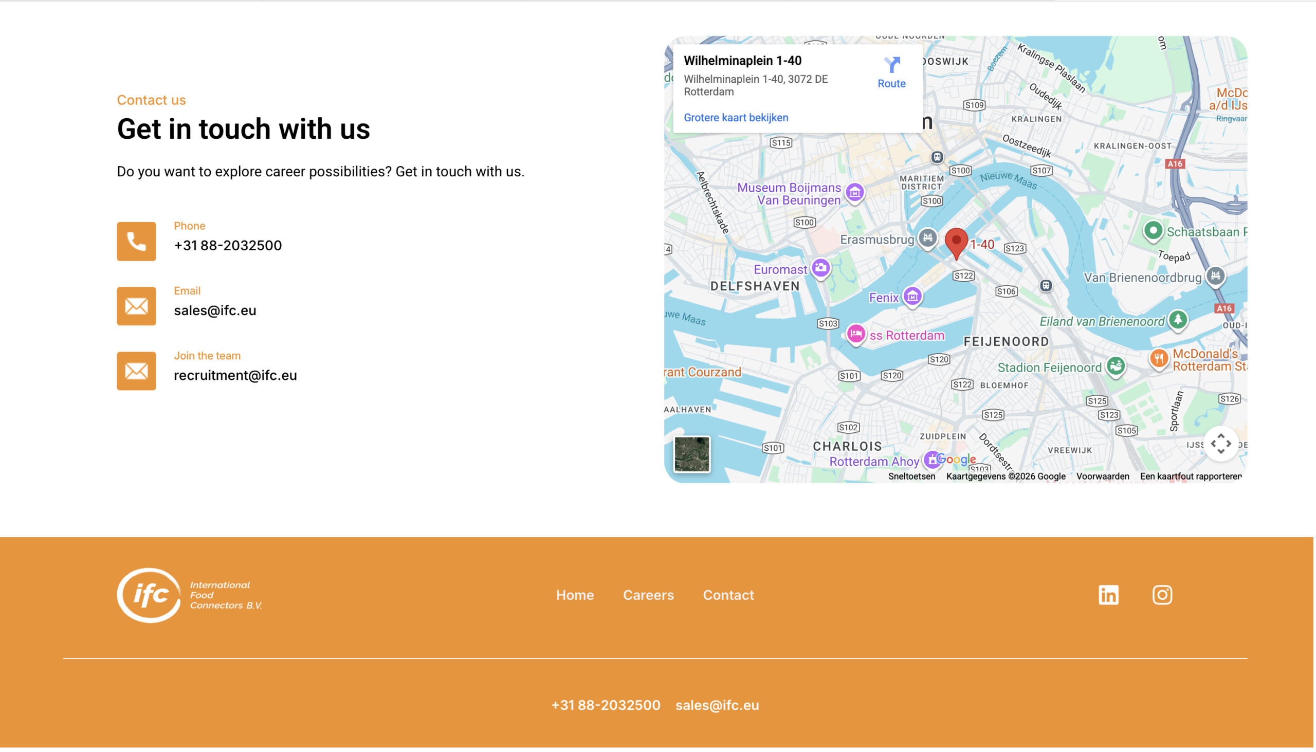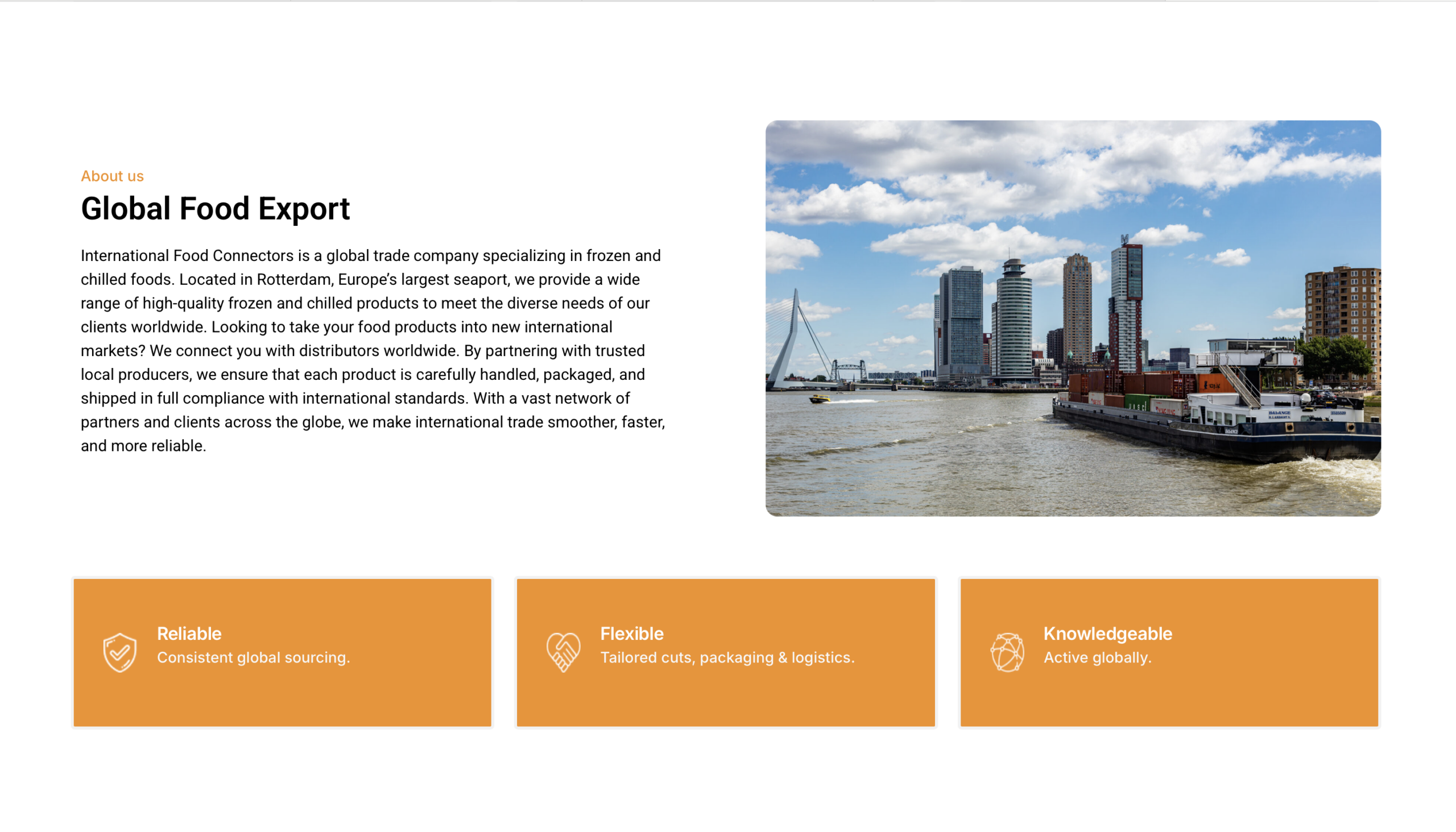International Food Connectors is een internationaal handelsbedrijf in de foodsector, gevestigd in Rotterdam. Het bedrijf is opgericht in 2017 door vier traders, die vandaag de dag samen de directie vormen. Met een team van ongeveer 40 medewerkers is International Food Connectors actief in de wereldwijde handel van proteïne producten, zoals vlees, vis en fruit, zowel vers als bevroren. De producten worden ingekocht bij slachthuizen en boeren en direct via scheepvaart geleverd aan klanten over de hele wereld. Welke producten het meest worden verkocht, verschilt per afzetmarkt.