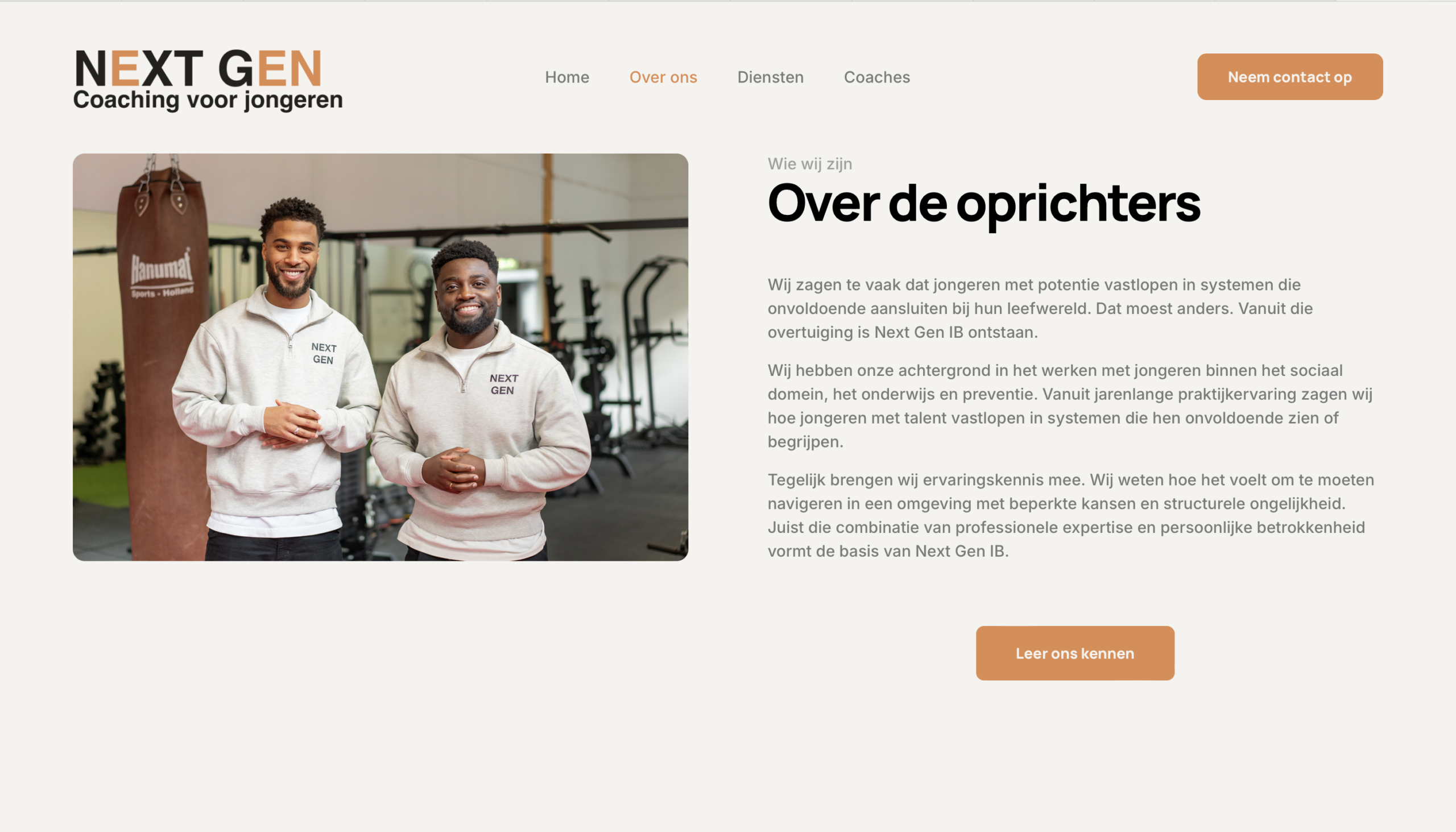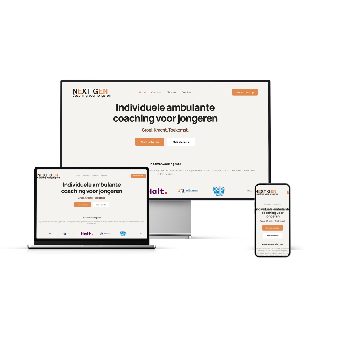 We zijn gestart met een verdiepend gesprek waarin niet alleen werd gesproken over diensten, maar vooral over wat de drijfveren zijn voor de heren. Wat zien jullie gebeuren bij jongeren? Wat moet iemand voelen wanneer hij of zij op de website komt? Vanuit dat fundament is het verhaal opgebouwd. Helder, toegankelijk en mensgericht. Geen moeilijke termen, maar taal die vertrouwen wekt. Vervolgens hebben we de visuele identiteit aangescherpt. Door subtiele aanpassingen in het kleurgebruik en verfijning van het logo kreeg de website rust en samenhang. De gekozen stijl straalt professionaliteit uit richting gemeenten en scholen, terwijl de benadering richting jongeren laagdrempelig blijft. Om het verhaal écht tot leven te brengen, is er een fotoshoot georganiseerd. De authentieke beelden van de oprichters zorgen voor herkenbaarheid en vertrouwen wat essentieel is binnen de jeugdzorg.Het resultaat is een website die niet alleen informeert, maar ook een open uitstraling heeft. Een online omgeving waarin duidelijk wordt wie Next Gen IB is, waar zij voor staan en voor wie zij er zijn. De missie voelt nu niet alleen sterk, maar is ook zichtbaar en begrijpelijk. De organisatie presenteert zich als betrokken partner voor jongeren, ouders en ketenpartners.