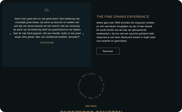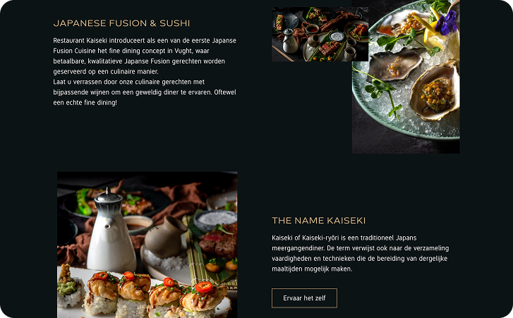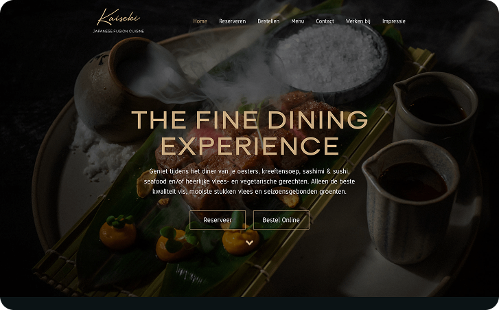 Op basis van de karakteristieke huisstijl van Kaiseki werd een stijlvol en elegant design ontwikkeld voor de nieuwe website. Na goedkeuring door de eigenaar van het restaurant, werd een functionele en dynamische site ontwikkeld op een testomgeving.Tijdens het ontwikkelingsproces werden diverse tests en controles uitgevoerd op de testomgeving om ervoor te zorgen dat de site optimaal zou functioneren wanneer deze opgeleverd werd. Na een grondig updategesprek met de eigenaar en goedkeuring van de testsite, werd de migratie van de website uitgevoerd op een vooraf afgesproken moment, dit is gedaan om de gevolgen van eventuele downtime te minimaliseren.